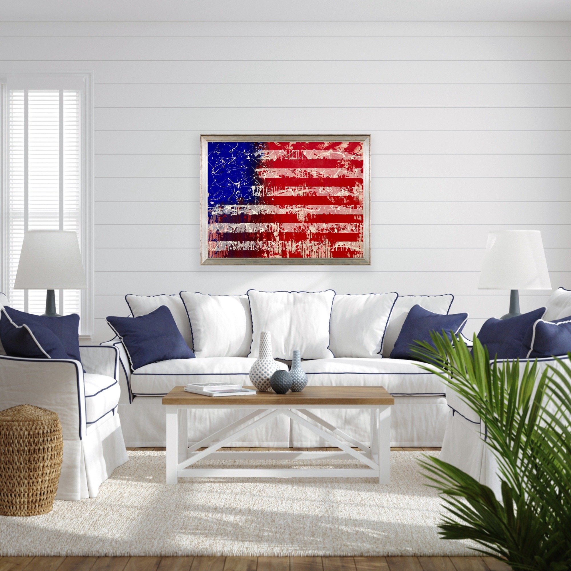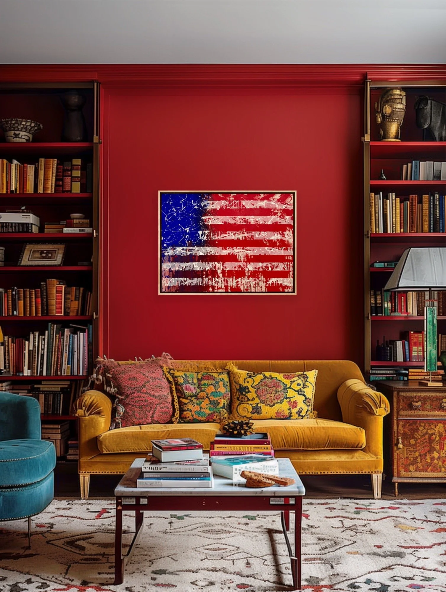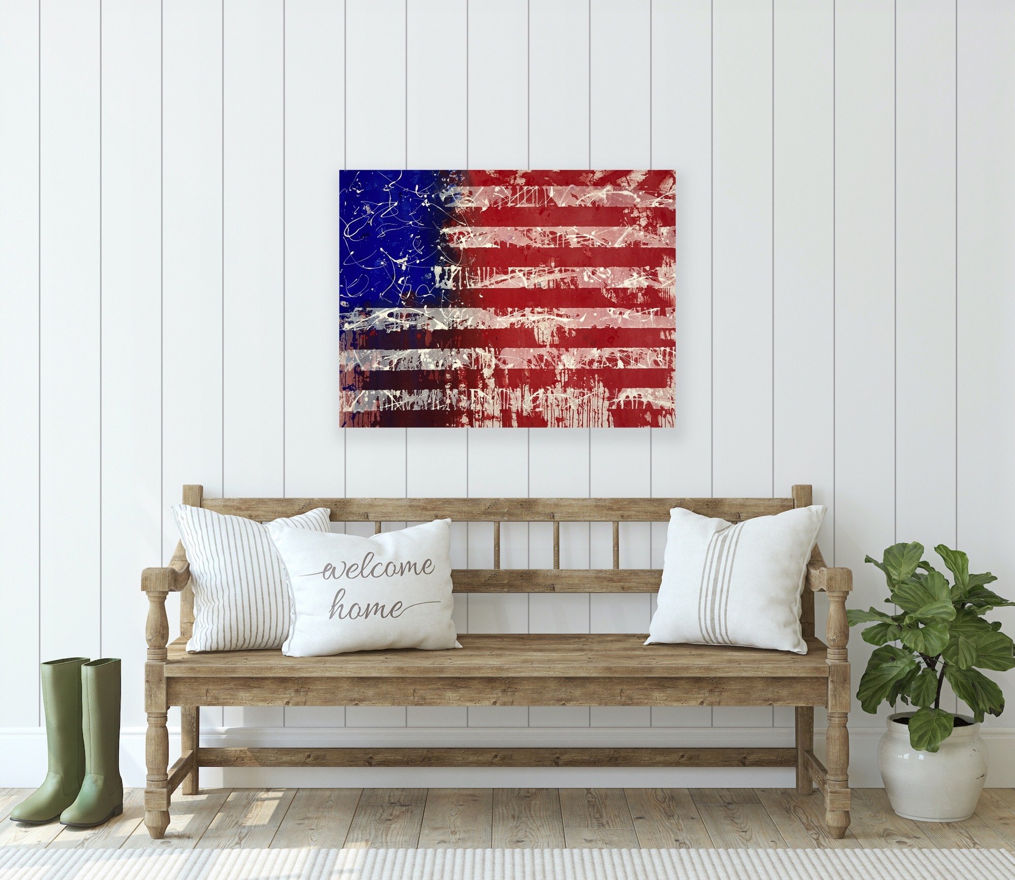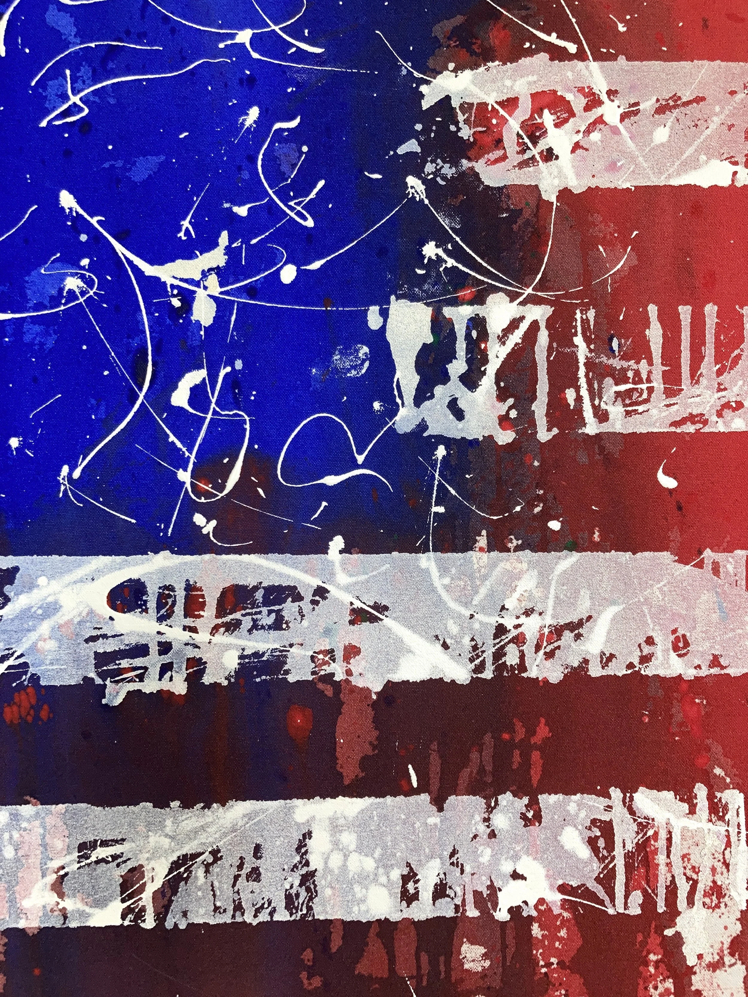 Original acrylic on canvas, this artwork offers viewers an abstract representation of the American flag. It combines several techniques including, splashing, dripping, splattering, and masking to create a cohesive and compelling visual presentation. The desire to paint the flag emerged within the political climate of the 2024 Presidential election, and the works of Jasper Johns inspired its creation in this style. The painting and its title invite interpretation.
